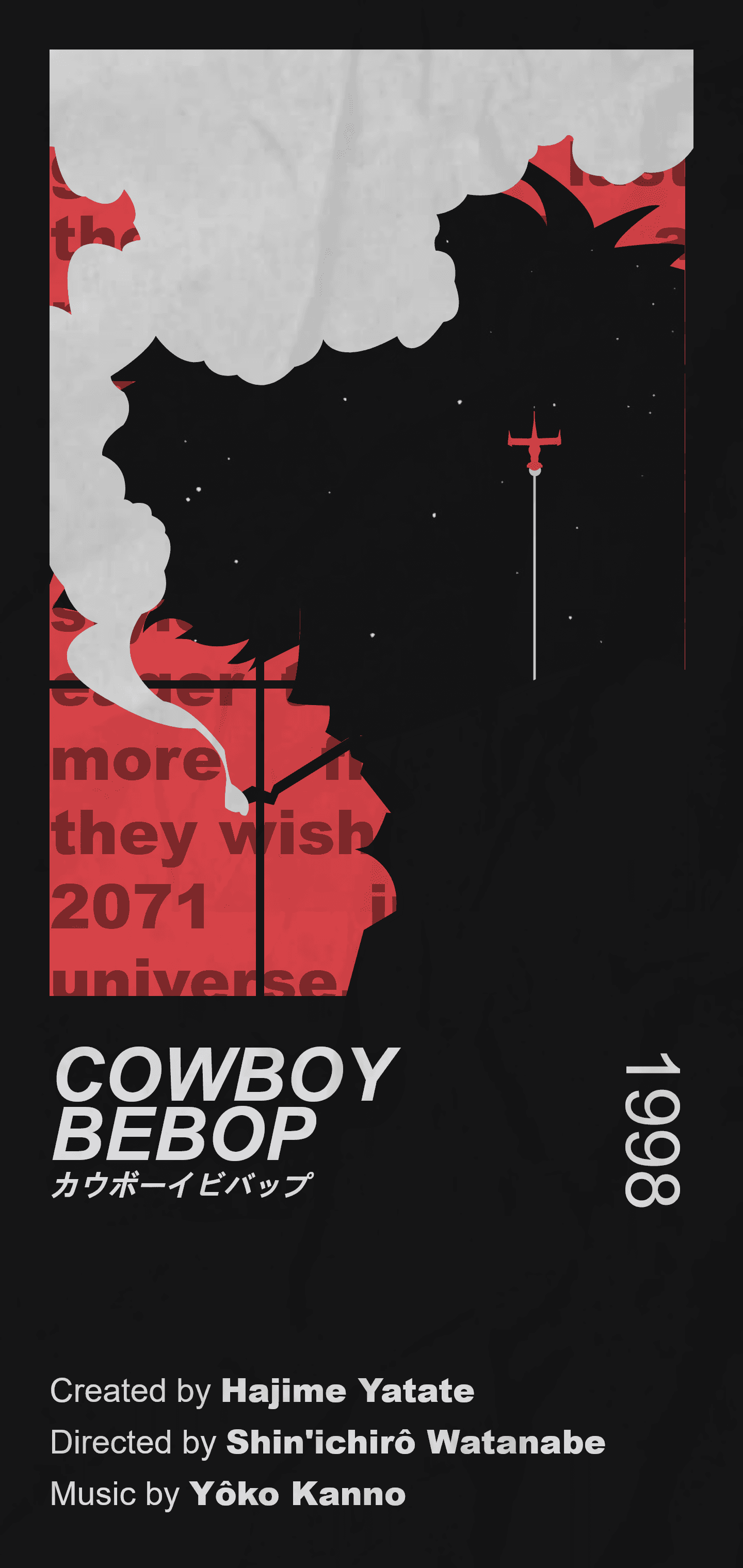 Trying to avoid unnecessary complexity, I approached this project from a minimalist perspective, I created a plain HTML file with tailwindcss and made a responsive design with two major blocks, one for the text content and the other for the silhouette; In the second one, I took inspiration from the show's opening where we can find bits of a paragraph overlayed on the solid color to tell a history ending with the ambitious phrase that gives title to the website: "The work, which becomes a new genre itself, will be called... COWBOY BEBOP".
